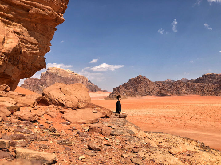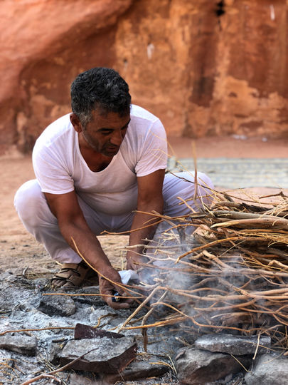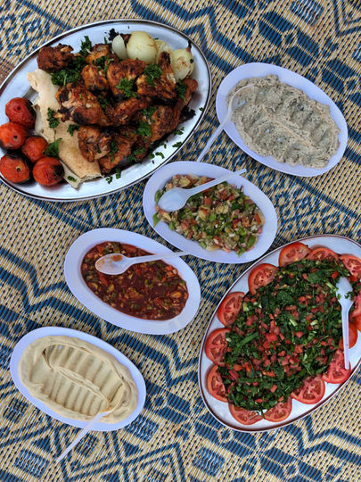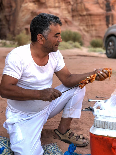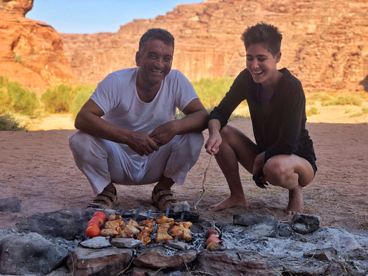 Our Bedouin guide provided an unforgettable day. We traversed the desert, stopping to explore sandstone dunes, canyons and arches, while he regaled us with stories about his family. Yet the best part was when Mohammed took us to his “restaurant”: a fire pit at the mouth of a rusty sandstone canyon in the middle of the desert, surrounded by broom and wild caper plants. He prepared skewers of chicken he had killed and marinated that morning, and salads full of ingredients from his farm. While coaxing a fire into existence, he hummed Bedouin tunes, then chopped vegetables faster than many professional chefs. Tongue out, he turned the skewers over the embers, urging them to cook faster, then checked their doneness by squeezing a piece of pita bread around the pieces of turmeric-dyed golden chicken. The meal was one of the best I’ve had: a bounty of chicken, hummus with cardamom, Bedouin salad, babaganoush, grilled tomatoes and onions rendered sweet from their time in the coals. With mounds of pita and our hands, we devoured the meal to the sound of Bedouin radio echoing through the silence of the desert.